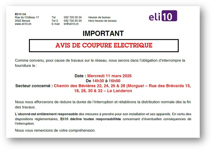 Pour cause de travaux sur le réseau, eli10 sera dans l'obligation d'interrompre la fourniture d'électricité le :